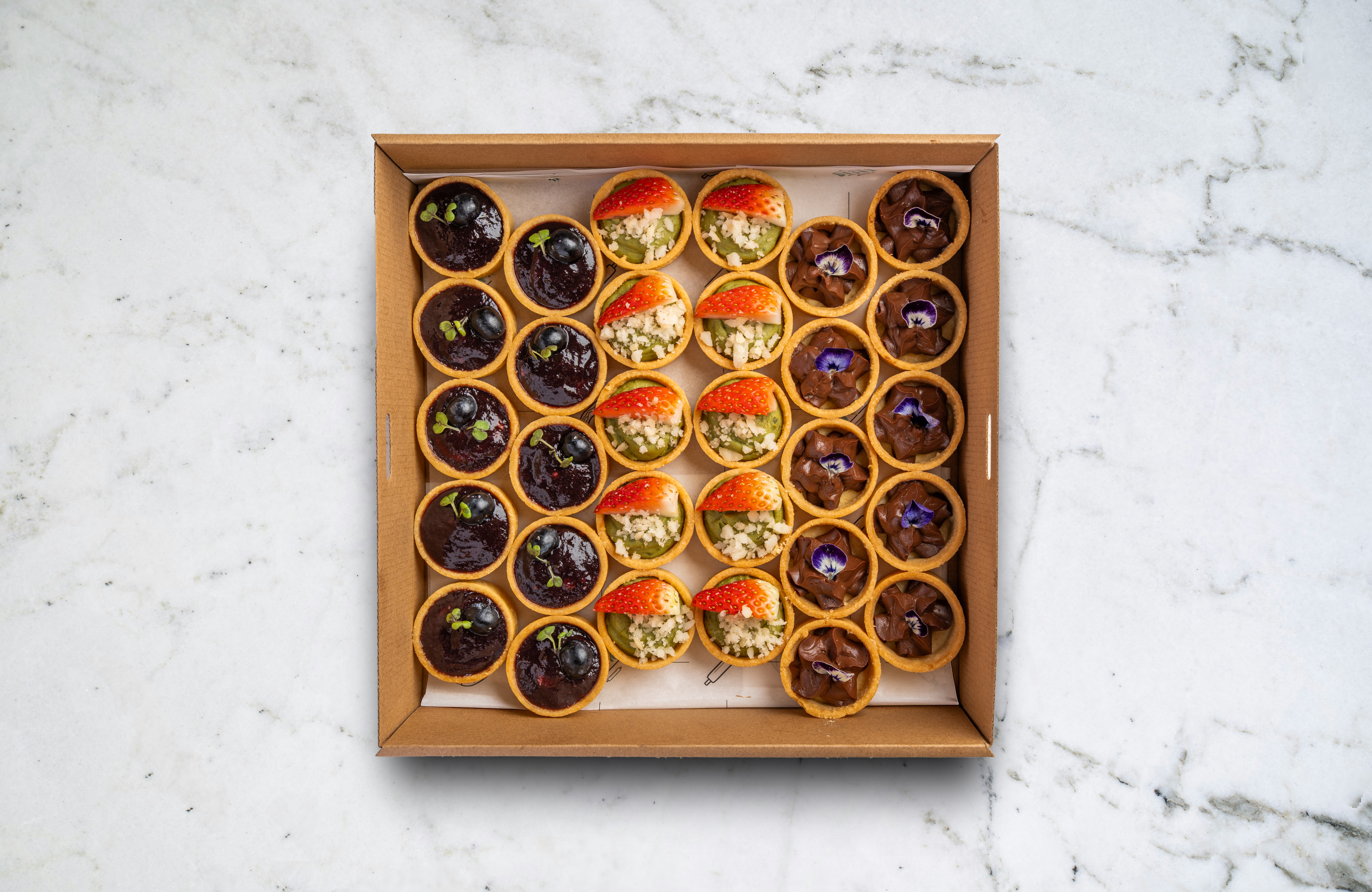 Indulge in 30 pieces of sweet canapé bites featuring rich matcha cream, fresh strawberry, and crunchy macadamia nuts—a delightful fusion of flavors and textures in every bite.