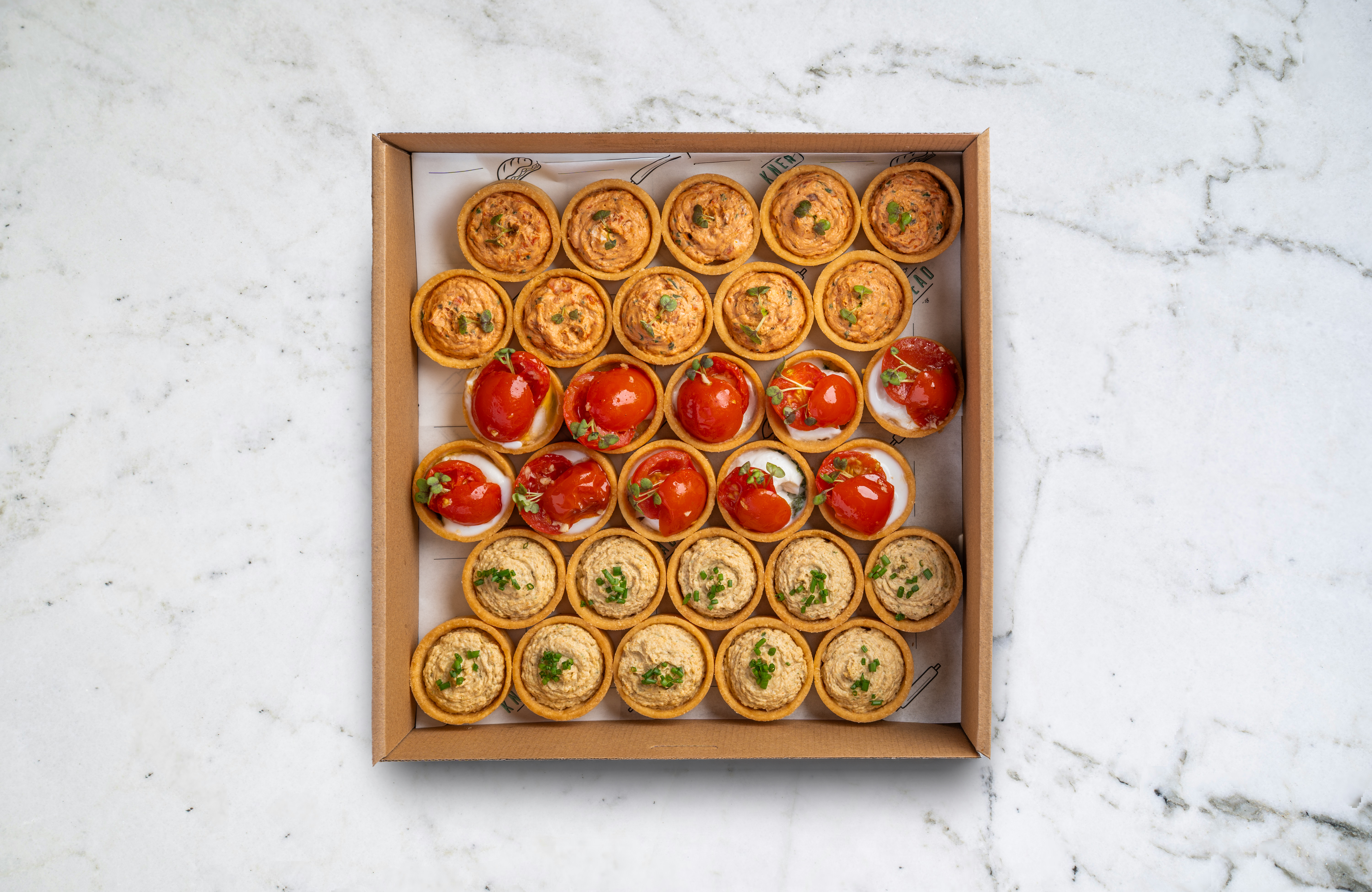 Enjoy our vibrant vegan/vegetarian crostini, topped with fresh, seasonal ingredients. A delightful, plant-based treat (20 pcs) Full ingredients crostini Sun dried tomato pesto with almonds & micro herbs (vg) Mozzarella, confit tomato & micro herbs (veg) Mix mushroom with truffle sauce (vg)